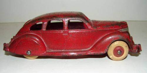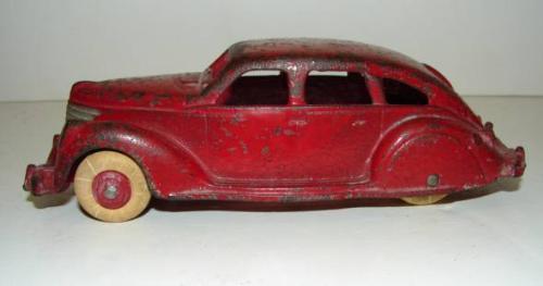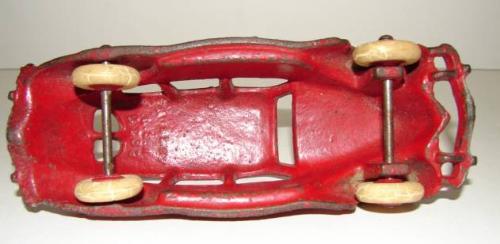 ANTIQUE HUBLEY CAST IRON SEDAN IN ORIGINAL RED AND SILVER PAINT. Original wheels. Marked “Hubley – USA – 2232”. Overall good condition with minor wear to paint and wheels.