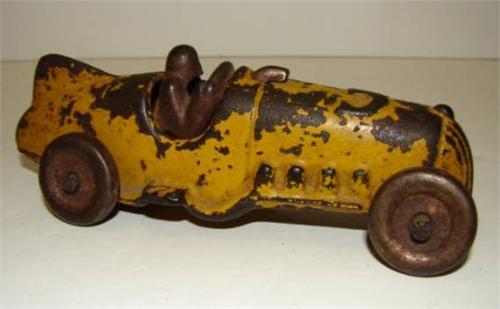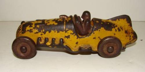 ANTIQUE HUBLEY CAST IRON YELLOW RACER IN ORIGINAL YELLOW PAINT. With tin wheels. Paint in fair condition.