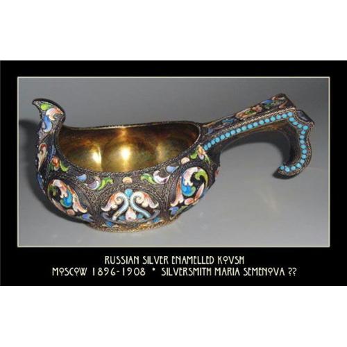 </font></strong>Authentic Russian Imperial silver kovsh with scalloped gold wash interior. Lovely enamel work of stylized flowers and patterned borders. Braided rim and beadwork. Bottom with barely visible Imperial Warrant mark, the double-headed Romanov eagle and also illegible makers mark. We didn't attempt to clean the tarnish and left it in original condition. Dimension : Approx. 4.5" (115 mm) long, 2.75" (70 mm) wide and 2.125" (53 mm) high. Very good original condition, no dents or repairs. Based on images available, this design and workmanship is indicative to work of Maria Semenova, a Russian silversmith of Imperial Russia. Larger photos for this pieces and web links for comparable (sold) pieces are available on request. </font>
