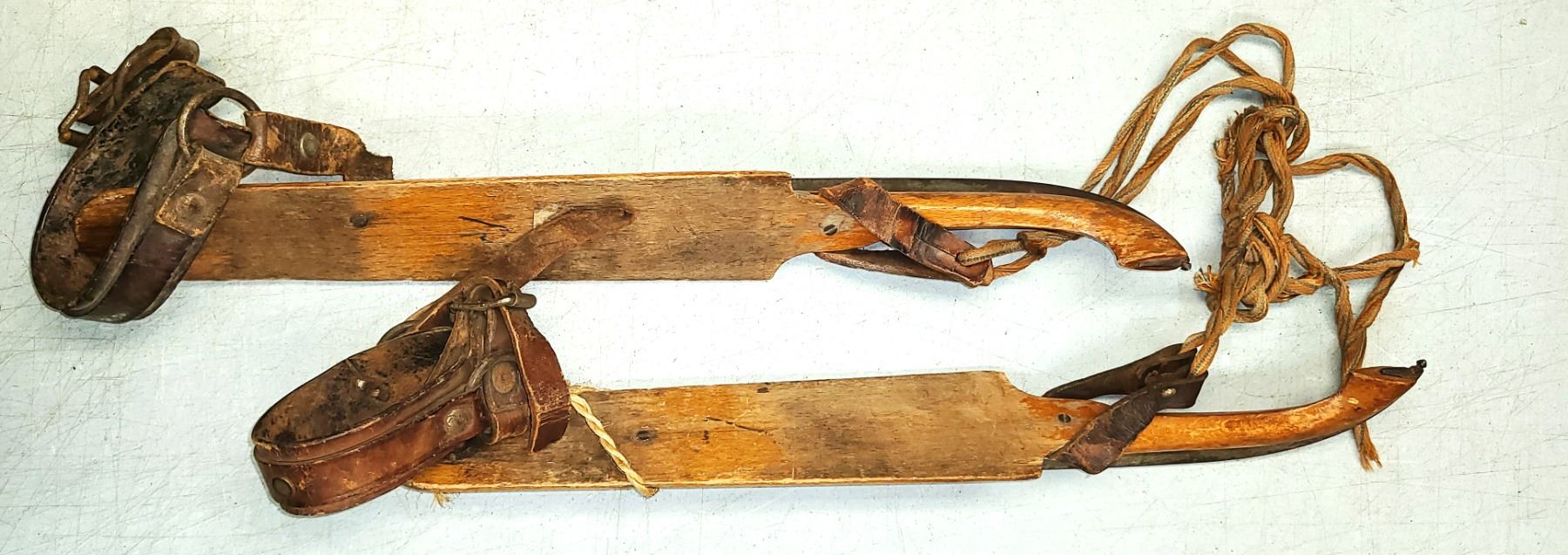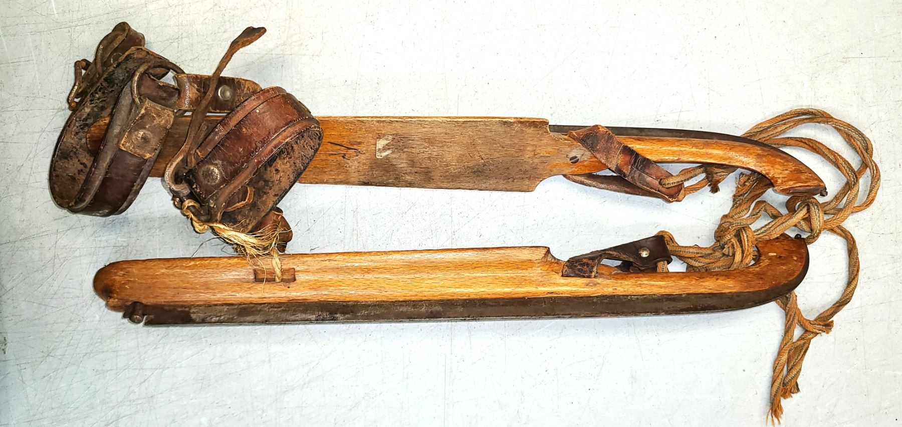 These ice skates appear to be from the late 19th to early 20th century. The wooden
