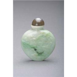 Antique and very well-hollowed, Chinese pale green jadeite snuff bottle of somewhat heart-form with carved dragon and phoenix motifs, agate stopper; H: 2 5/8"