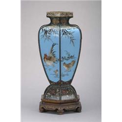 Tall, finely detailed and antique, Japanese cloisonnT enamel hexagonal vase with fowls amid florals on body, sea shells on base and phoenix roundels on neck, bamboo-form mounts (minor crazing, drilled and other flaws), late 19th Century; H: 22 1/2", original antique wood stand (flaws to stand)
