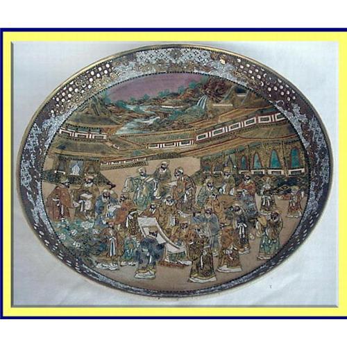 Antique Japanese Satsume shallow bowl with incredibly fine painting, gilding and enamelling. Sold to me as 18th century, it is certainly over 100 years old. 1 of 2 from the same collection.<BR>Measures 9 1/2inches in diameter and 2 inches high. <BR>Side profusely decorated with a tight pattern of scrolls, clouds, geometric and naturalistic forms in gold, white, red and green enamel on a deep earthy red ground. An unusually large group of scholars engaged in a variety of pursuits fill the bottom half of the bowl: one group examines a large scroll, some play Go, some discuss an open book, many of them with gold outlined fans. A child and watercarrier add to the colour. Detail of costume and faces is extraordinary. <BR>Behind the people are various pagodas and buildings with a naturalistic landscape in the background. Very fine detail to all parts of the painting, a lot of gold and enamel highlights. Great design.<BR>Back shows clear signs of good age. No chips/cracks (checked with blacklight). <BR>Previous owner had assessment done by a major auction house for $6000.-