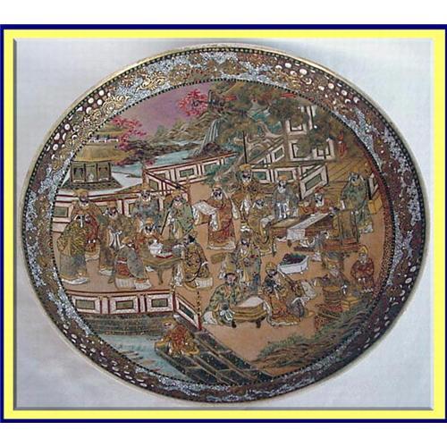 Antique Japanese Satsume shallow bowl with incredibly fine painting, gilding and enamelling. Sold to me as 18th century, it is certainly over 100 years old. 1 of 2 from the same collection.<BR>Measures 9 1/2inches in diameter and 2 inches high. <BR>Side profusely decorated with a tight pattern of scrolls, clouds, geometric and naturalistic forms in gold, white, red and green enamel on a deep earthy red ground. An unusually large group of aristocrats, engage in a variety of pursuits fill almost 3/4 of the bowl: one group is engaged in a drinking ceremony, some play Go, many read from books and scrolls, some with gold outlined fans. A child sits next to a pool and watches the koi fish swim. Detail of costume and faces is extraordinary. <BR>Behind the people are various pagodas and walls with a beautiful naturalistic landscape in the background. Very fine detail to all parts of the painting, a lot of gold and enamel highlights. Great design.<BR>Back shows clear signs of good age. No chips/cracks (checked with blacklight). Gilding on rim (only) is worn. <BR>Previous owner had assessment done by a major auction house for $6000.-