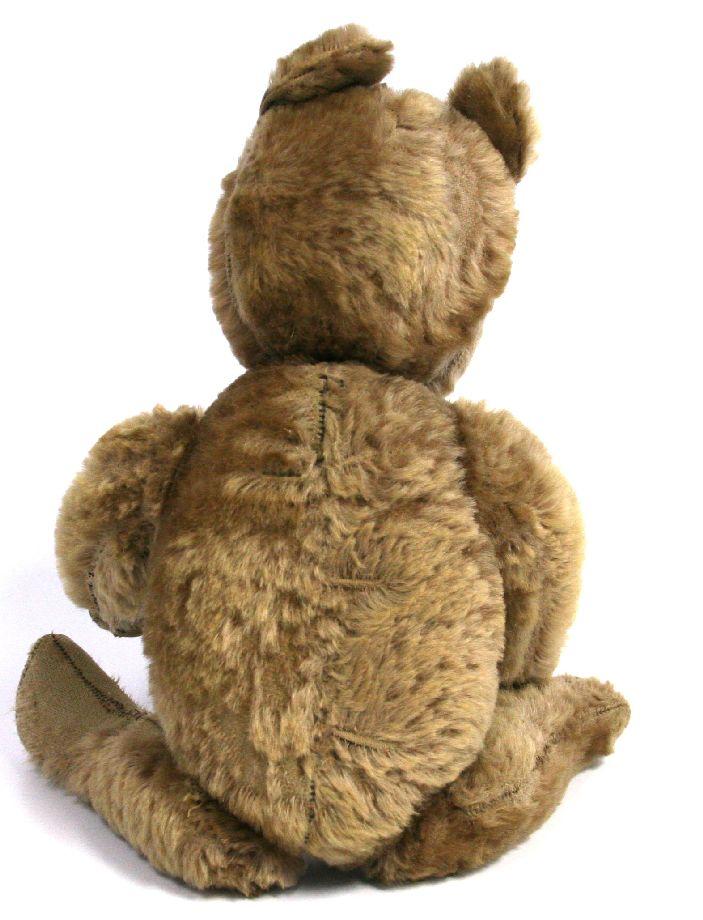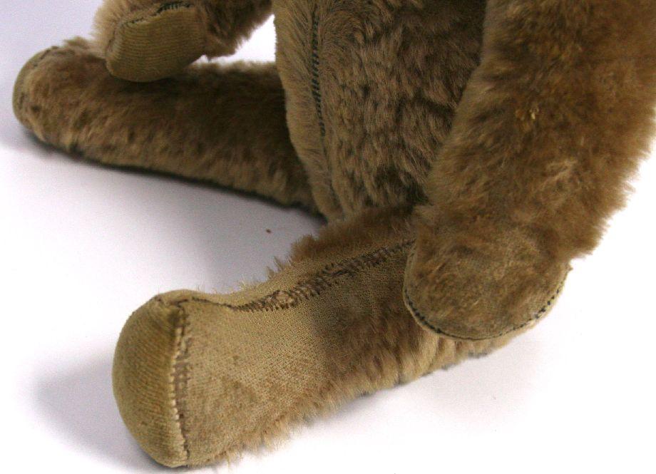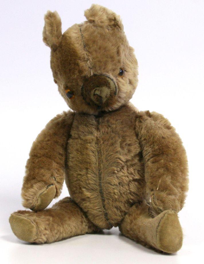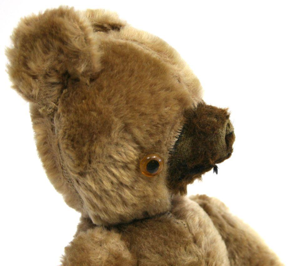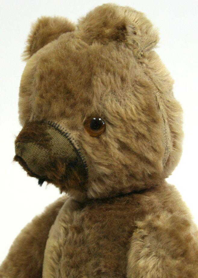 A jointed glass eye 19 inch teddy bear, some thread bare spots and moderate to heavy play wear.