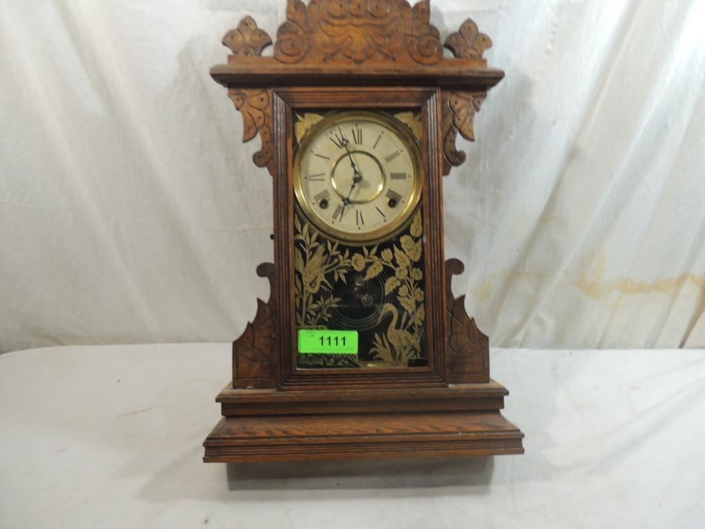 KITCHEN CLOCK, GINGERBREAD CLOCK, DECORATIVE WOODEN CLOCK, UNQIUE CLOCK, ANTIQUE WORKING CLOCK, AS SHOWN SEE PHOTO FOR MORE DETAILS.