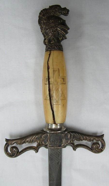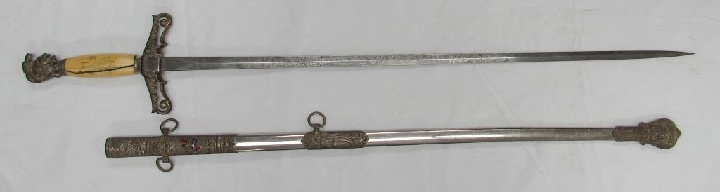 CEREMONIAL SWORD W/SCABBARD. BY THE HENDERSON AMES CO. KALAMAZOO, MICHIGAN. HANDLE IS SPLIT. NEEDS A GOOD CLEANING.