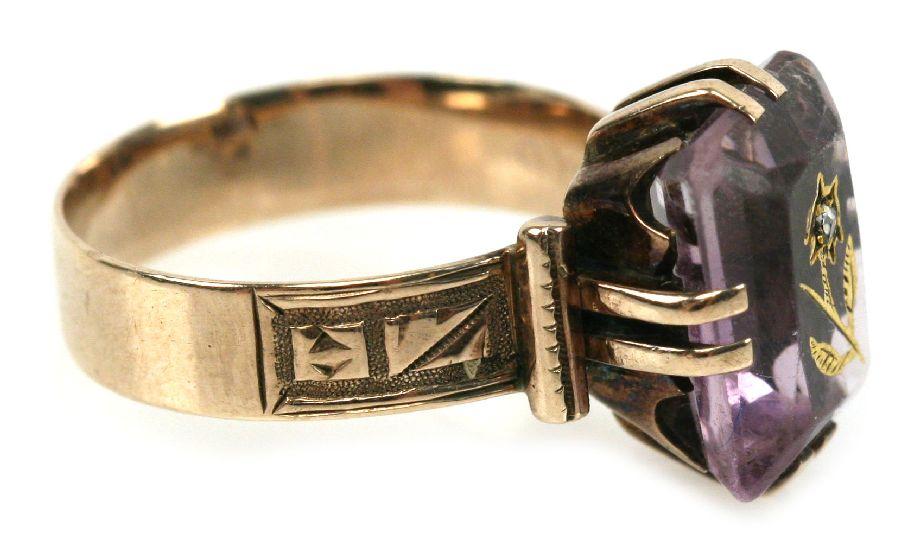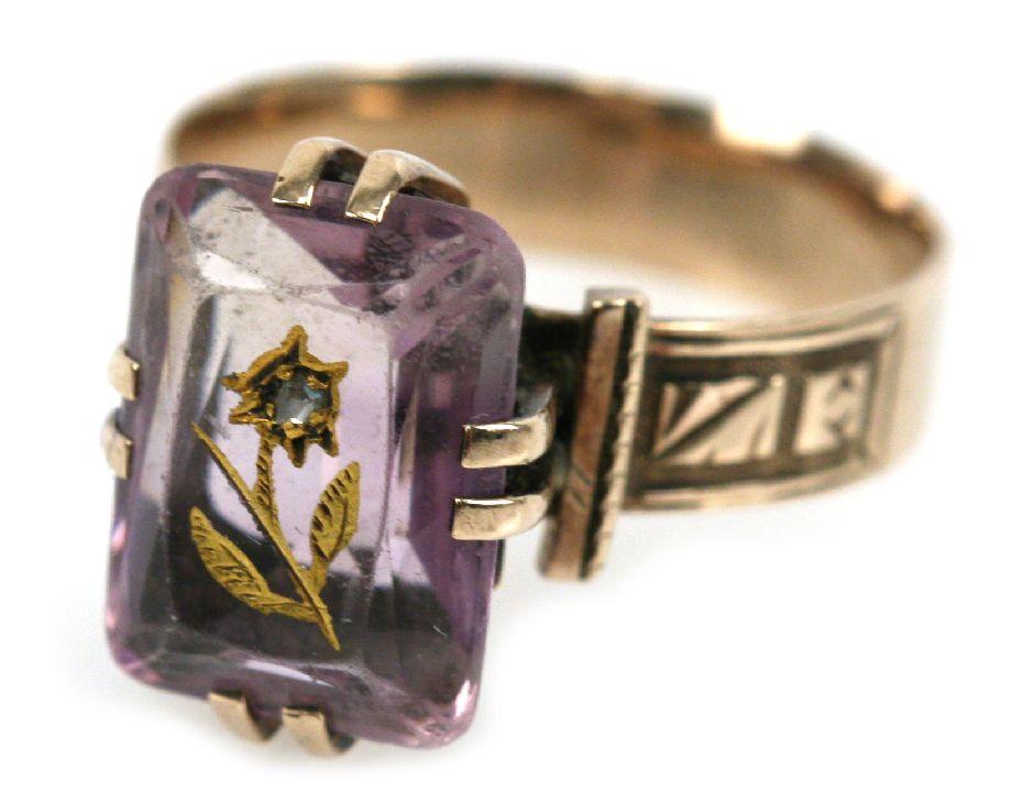 Approx. 3.7ct emerald cut amethyst with applied gold floral design and diamond chip inset. Size: 6.5 Weight: 3.9 g Condition: Very good condition with minor scratching to amethyst
