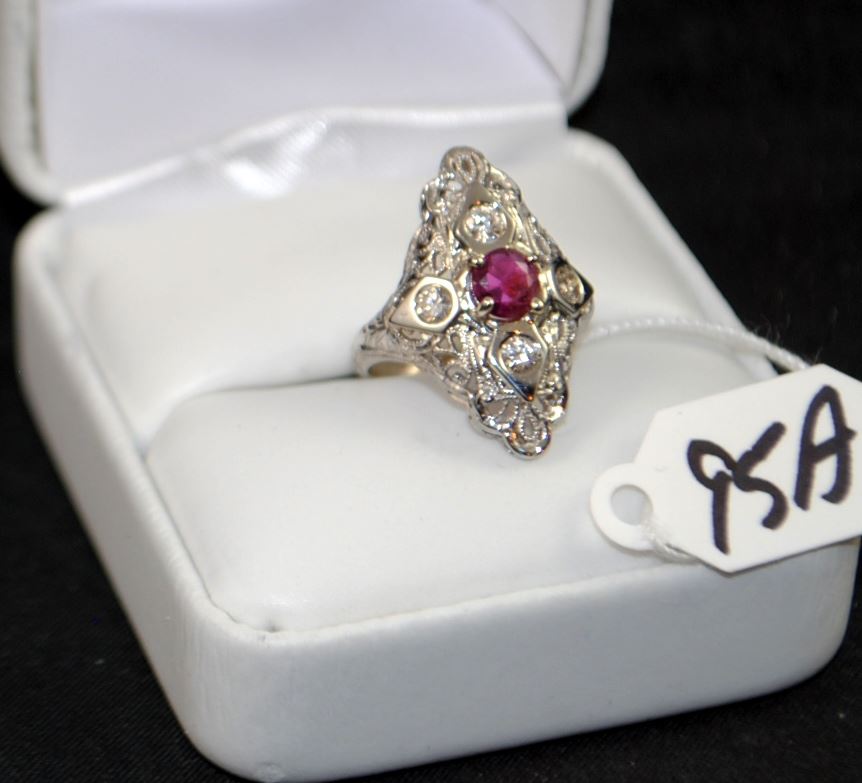 LADIES ANTIQUE 18K WHITE GOLD RUBY AND DIAMOND FASHION RING WITH ONE ROUND RUBY MOUNTED CENTER, WEIGHING 0.50CT, MED WITH SLIGHT INCLUSIONS, MED COLOR, A+ QUALITY. FOUR FULL BEZEL SET, FULL ROUND CUT DIAMONDS