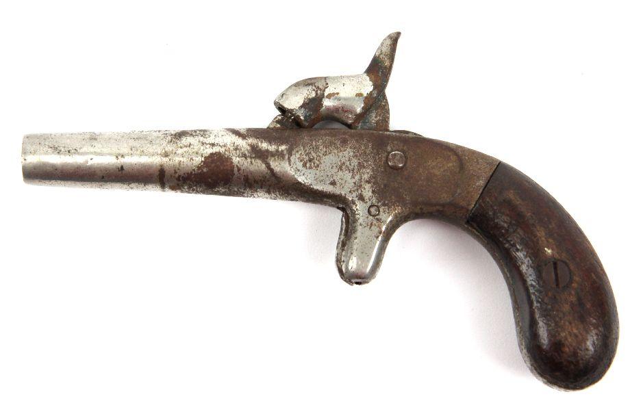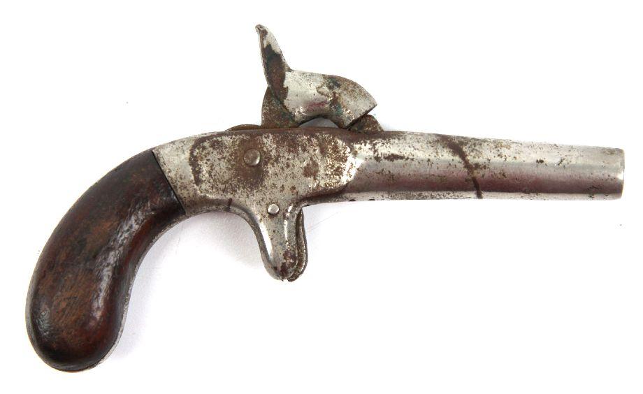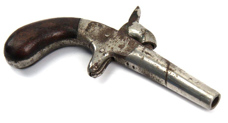 Ladies pocket percussion pistol. Appears about 30 caliber. Nickel plated, with rust. Marked "98" under barrel. Wood grips. Non firing condition. Caliber: .30