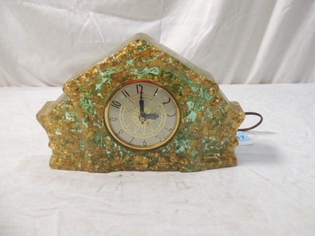 MANTLE OR SHELF STYLE ANTIQUE CLOCK. 7" TALL 10" LONG 2" DEEP PERFECT CONDITION AS SHOWN.