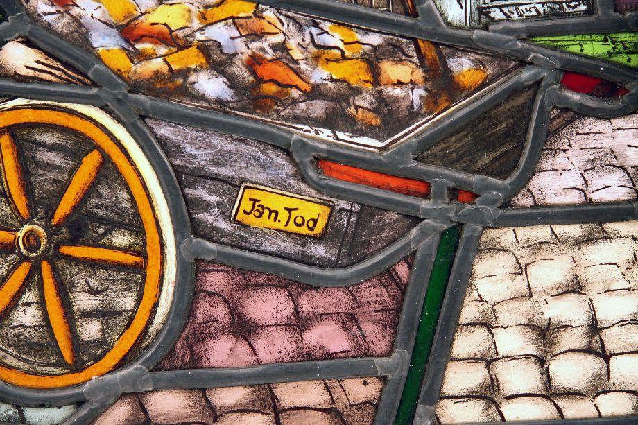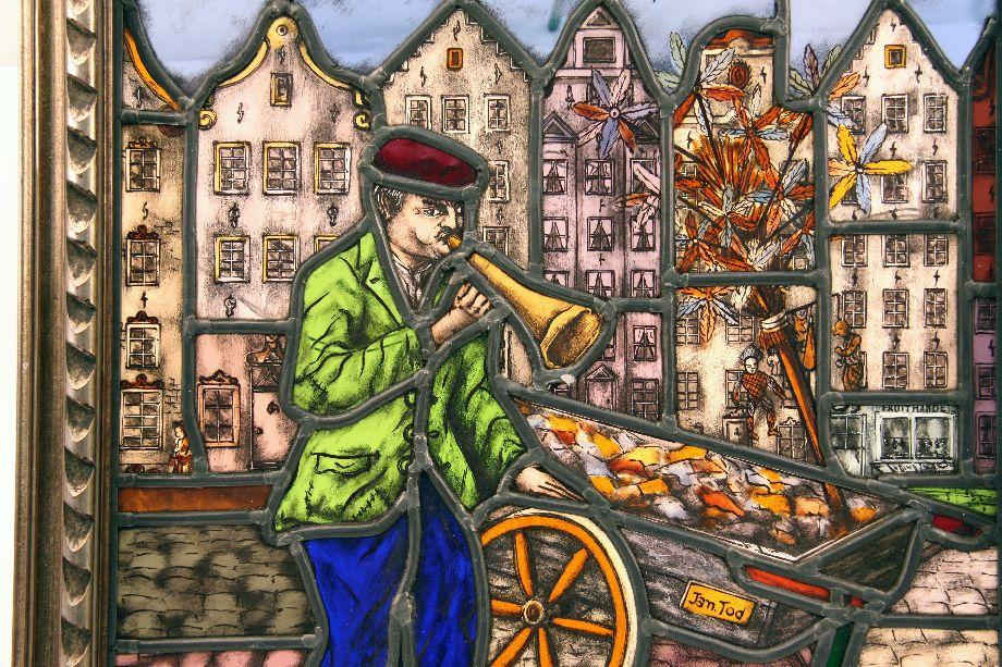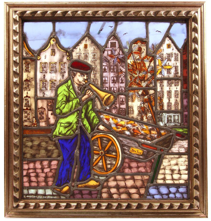 A Dutch street vendor scene with cart and typical row architecture behind. Panel size is 19 inches tall by 18 inches wide. Overall framed dimensions are 22 by 23 inches. 19th century to early 20th century. Very good condition with one unnoticeable minor crack to small piece of glass forming subjects right hand.
