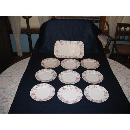 BEAUTIFUL EARLY T & V LIMOGES 10 PIECE ICE CREAM SET. GORGEOUSLY DECORATED WITH PINK FLOWERS AND IN PRISTINE CONDITION. THERE IS NO DAMAGE FROM CRACKS,CHIPS OR HAIRLINES. THE ICE CREAM PLATTER MEASURES 14" X 8.25" AND THE PLATES ARE 8.50" IN DIAMETER. THIS BEAUTIFUL SET APPEARS TO HAVE HAD VERY LITTLE USE DUE TO THE ABSENCE OF SCRATCHES ON THE SURFACE AREAS OF ALL THE PLATES. THE MARK IS FROM 1891-1900 AND THE DISPLAYED MARKS FROM THE PLATTER SHOW A PATENT DATE OF APRIL 2, 1889. THIS SET WAS MADE FOR OVINGTON BROTHERS IN BROOKLYN.