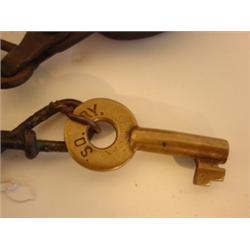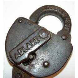 ANTIQUE LOCK WITH KEY. Key hole cover on lock is marked "Adlake". Lock is marked illegibly on reverse as well as on top. Key is connected to lock via chain. 3.5" L