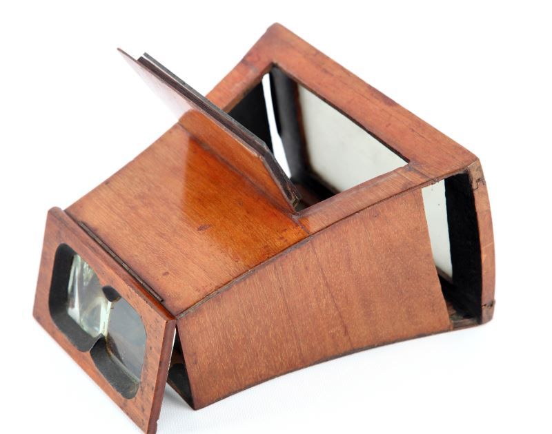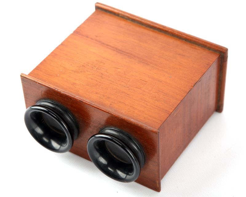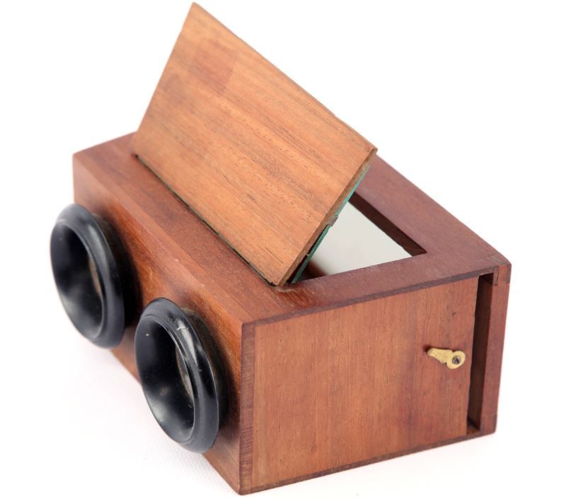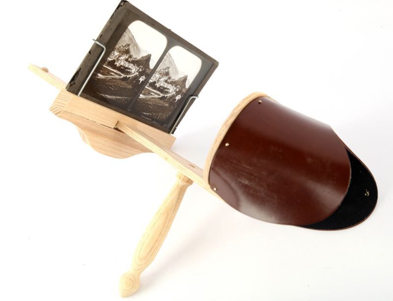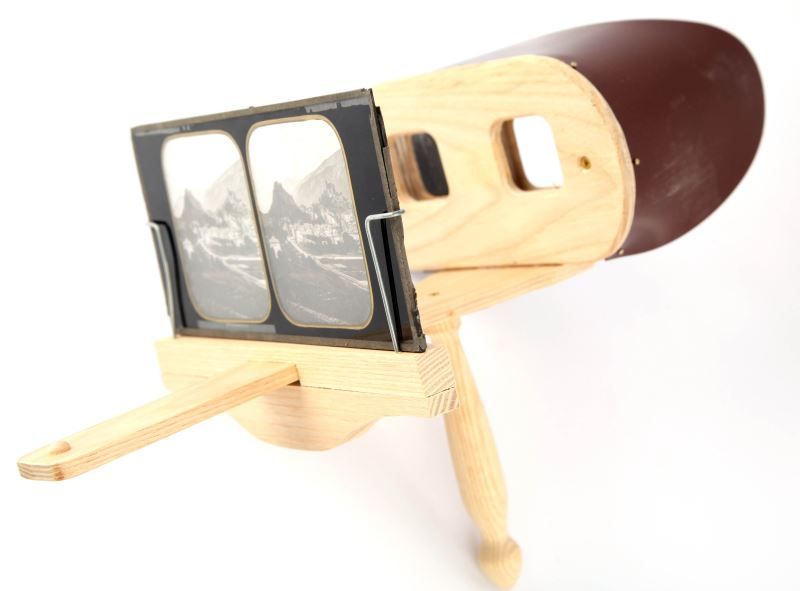 Grouping consists of three wooden stereo view stereoscope and one modern working copy of antique stereoscope with one card Panorama de Sion, Vallee du Rhone, Switzerland.