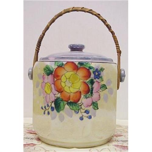 GORGEOUS ANTIQUE HAND PAINTED CHINA FANCY COOKIE JAR, MADE IN JAPAN,AND FINISHED IN BEAUTIFUL LUSTER FINISH, as per images, MEASURES 6" HIGH not counting the handle, EXCELLENT, CONDITION, US BUYER TO PAY 8.00 FOR SHIPPING PLUS INSURANCE.THANKS.