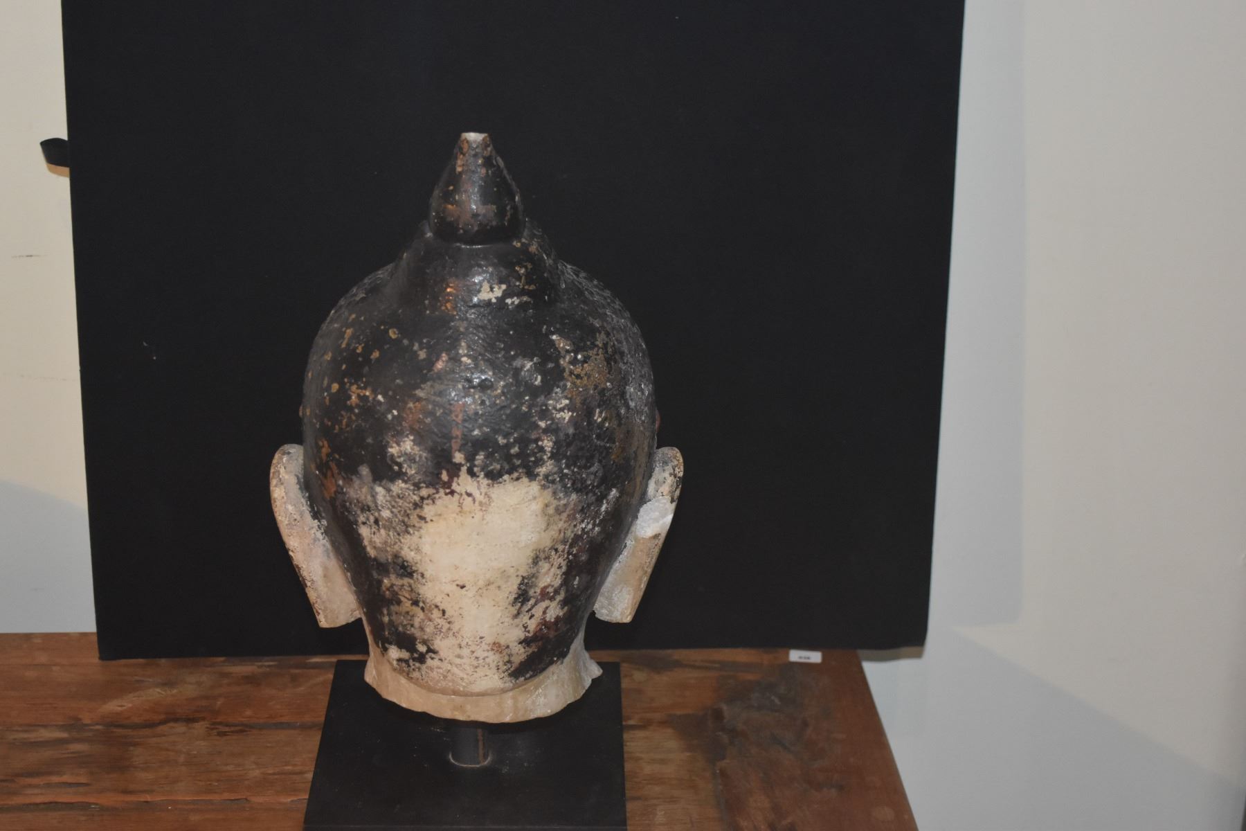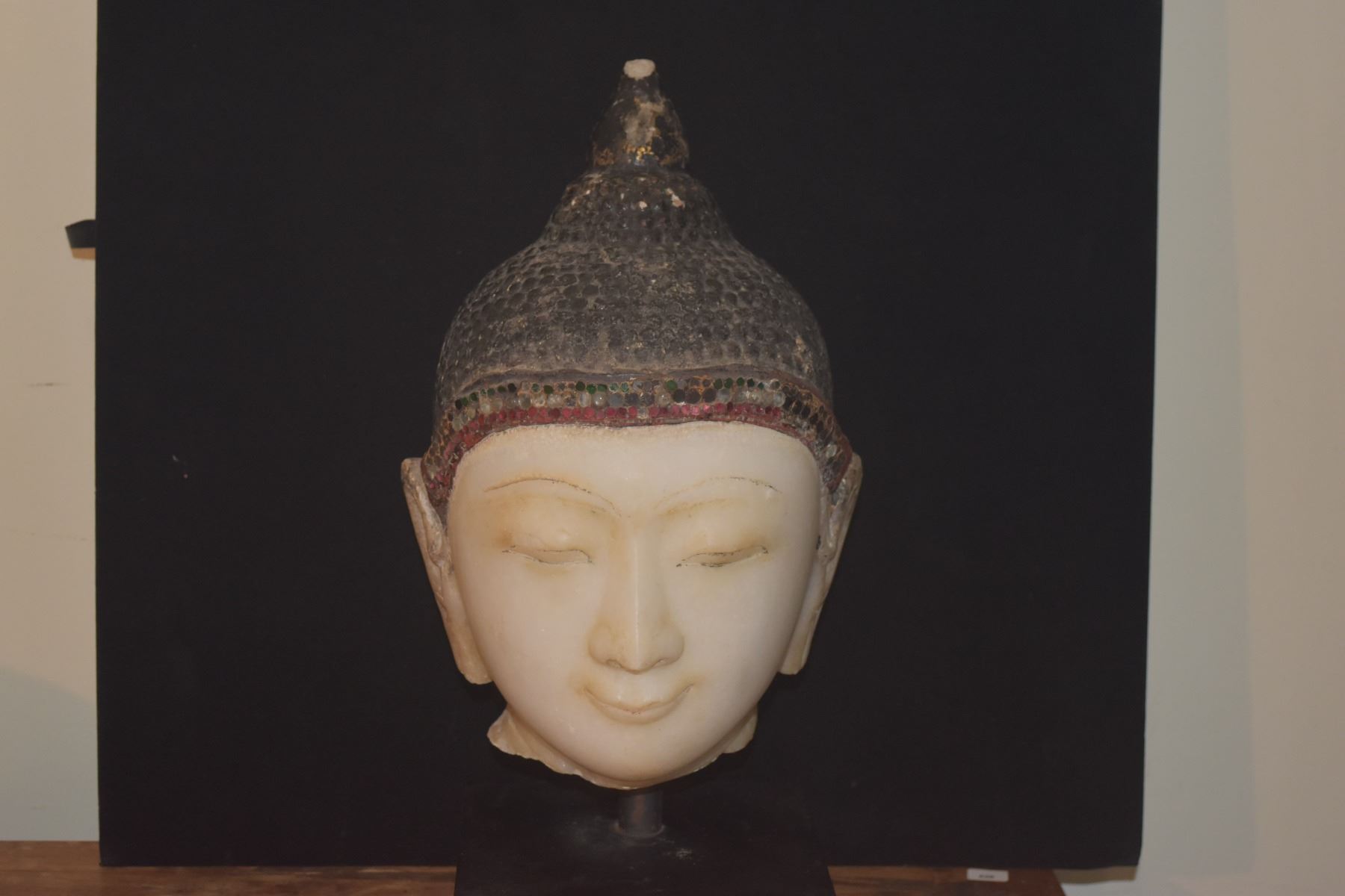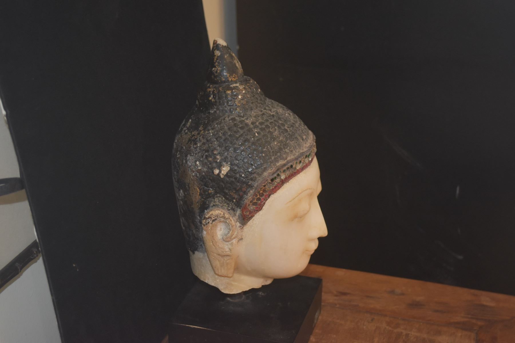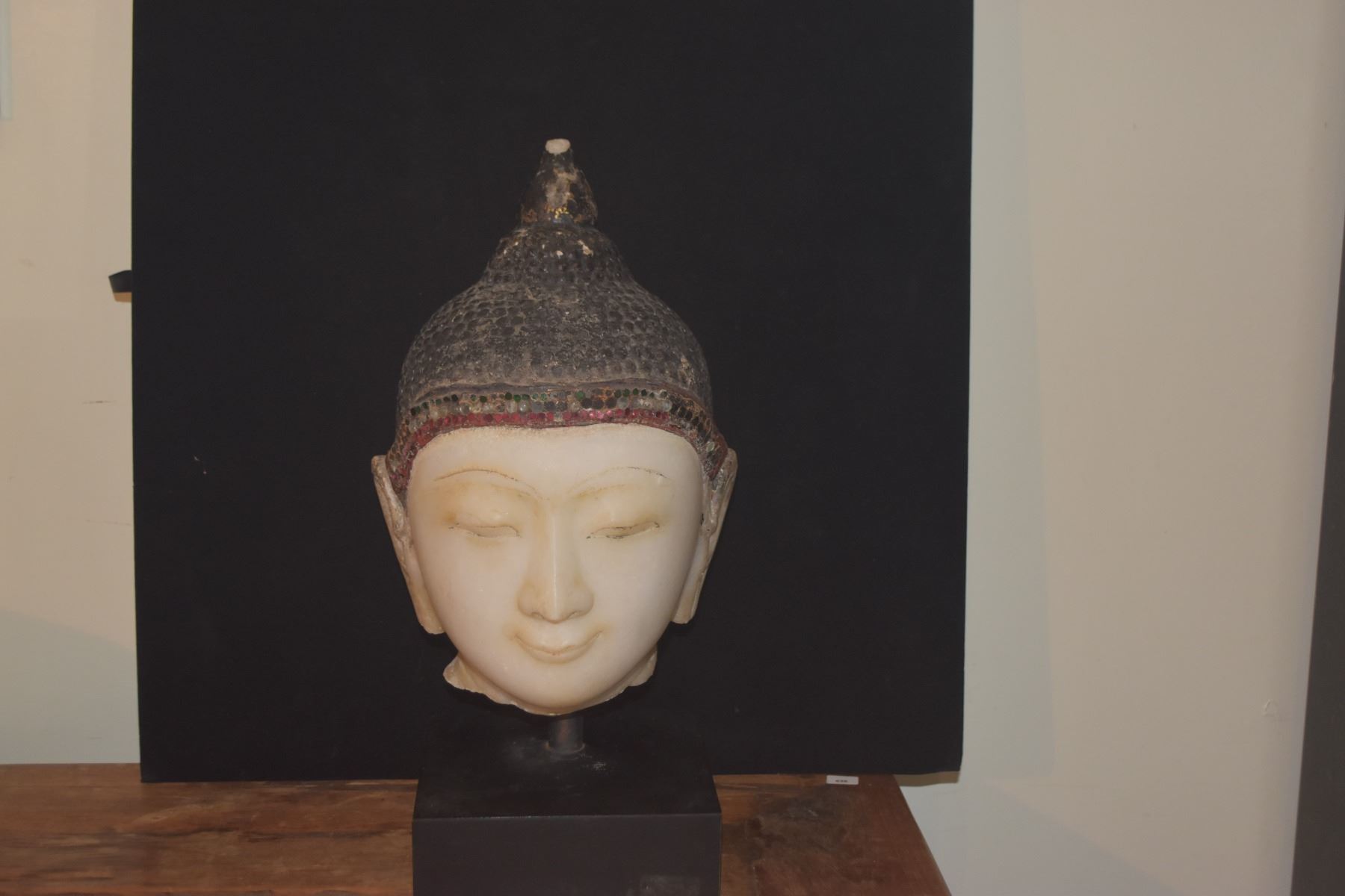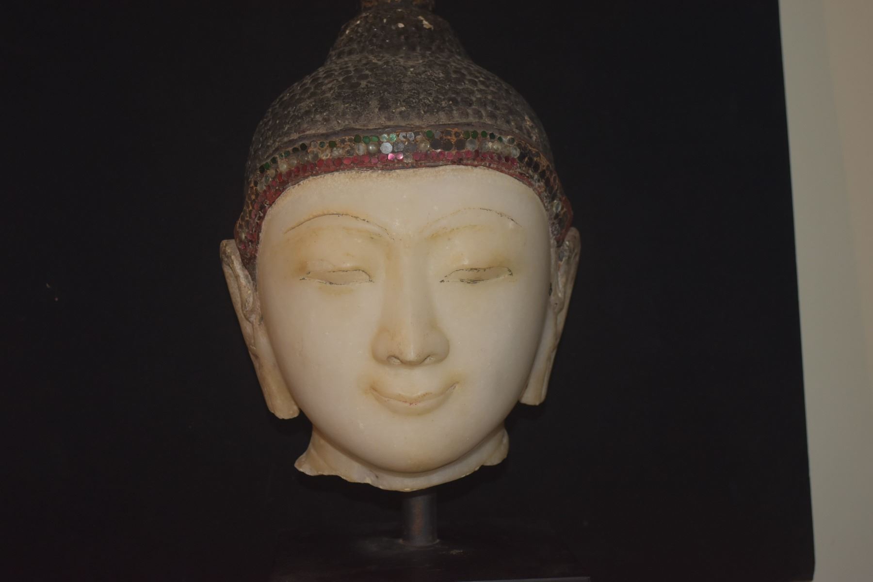 ANTIQUE MARBLE HEAD ON STAND, BEAUTIFUL FACE, BURMA (15 1/4")