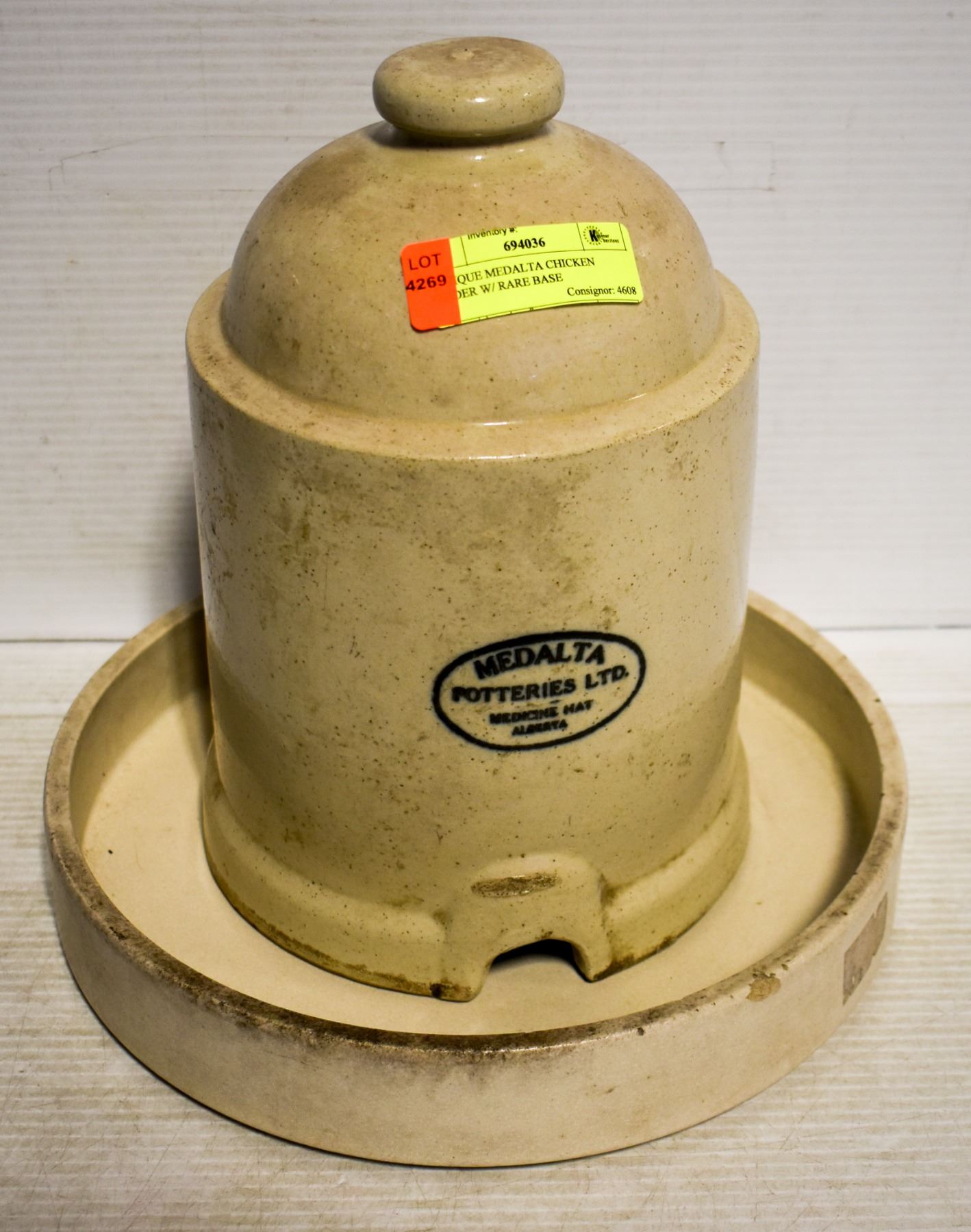 ANTIQUE MEDALTA CHICKEN FEEDER W/ RARE BASE