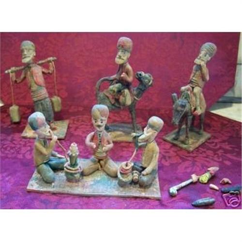 RARE - ANTIQUE SET OF MIDDLE EASTERN FIGURES - THEY ARE HANDMADE & VERY OLD - ESTATE FIND -  THEY APPEAR TO BE WOOD & ARE HAND CARVED & PAINTED. I HAVE SOME OF THE PIECES WHICH HAVE BEEN BROKEN OFF & CAN EASILY BE GLUED BACK ON.  THERE MAY BE PIECES WHICH ARE MISSING. THERE IS CRACKING/PAINT WEAR &/OR CHIPS.  THERE ARE 4 PIECES IN THIS SET, THEY ARE ALL ON WOOD BASES.  VERY NICELY DETAILED.  THESE ARE POSSIBLY TURKISH FIGURES & ARE FROM THE 1920's-1930's.
