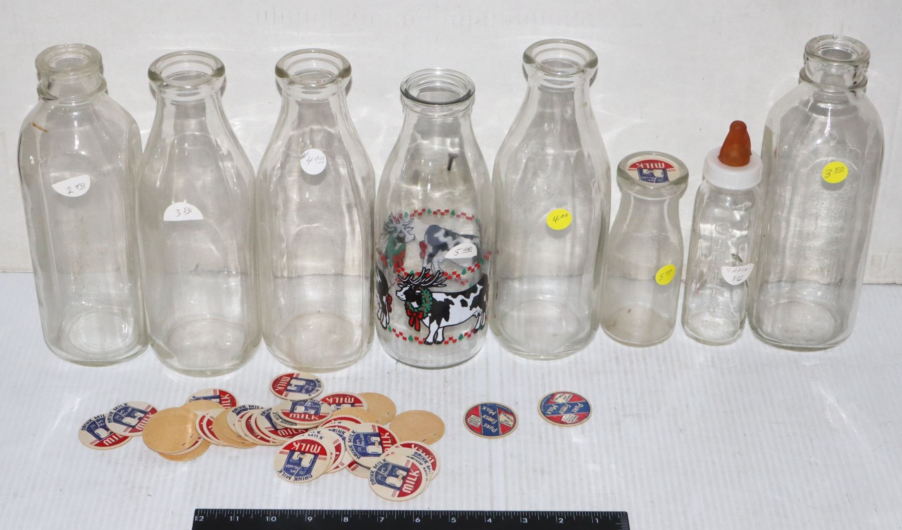 6 LARGE. ONE GLASS BABY BOTTLE, ONE WITH A COW MOTIF