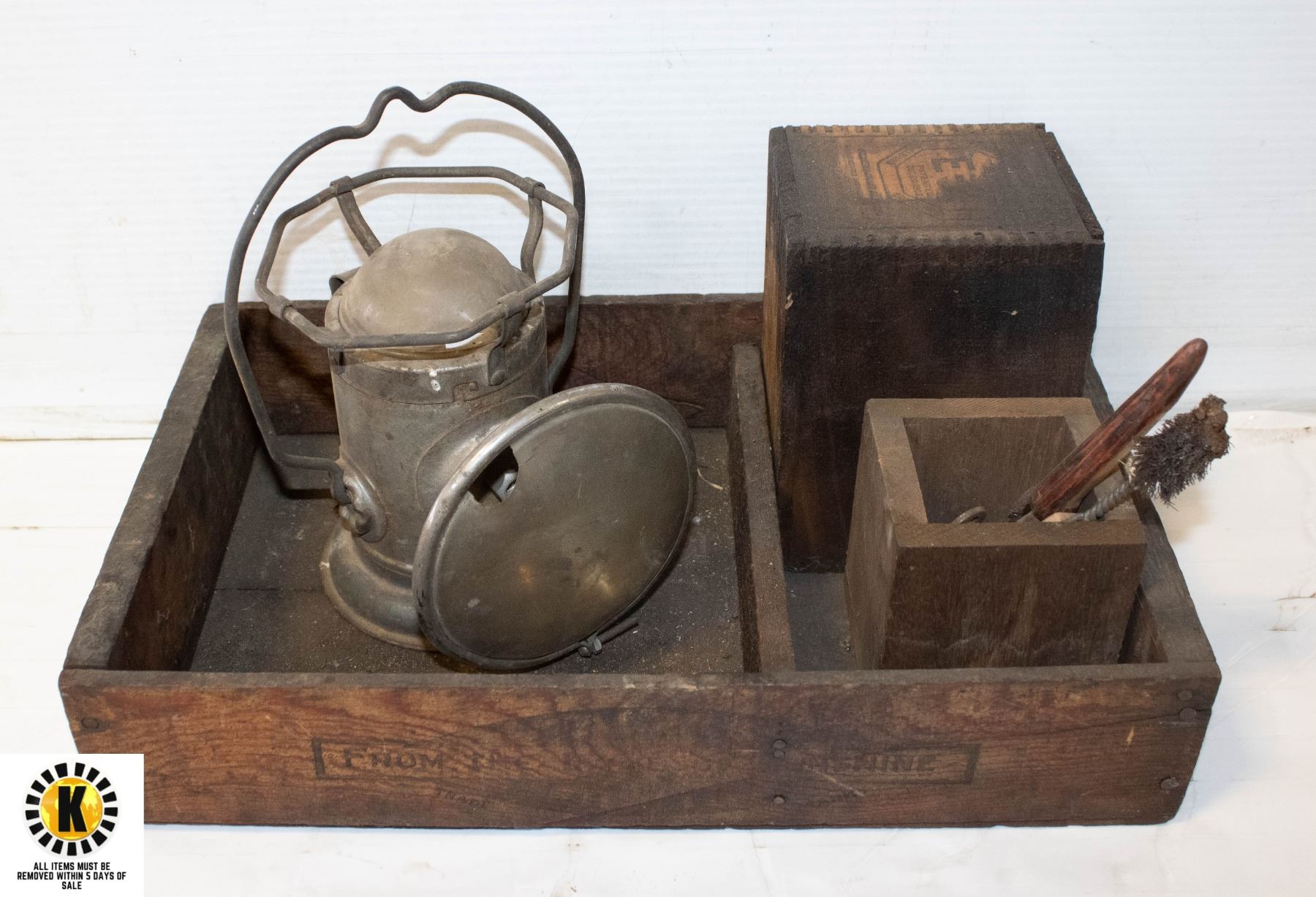 ANTIQUE MINERS LAMP & ANTIQUE WOOD CRATES-ESTATE