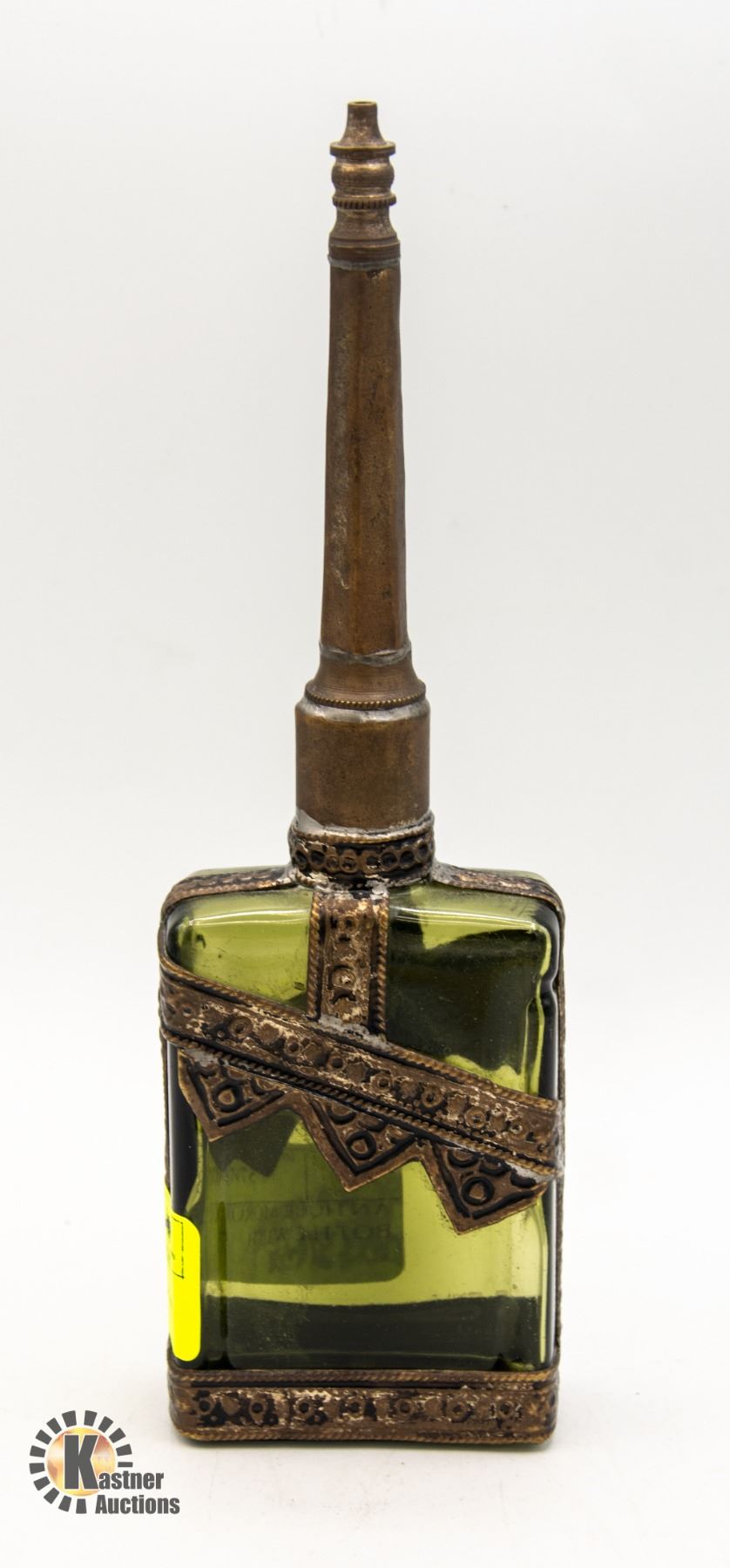 GREEN GLASS, METAL TWIST-ON STOPPER WITH ORNATE METAL EXTERIOR, MADE IN PARIS (8.5"-TALL) - ESTATE **ALL ITEMS MUST BE REMOVED BY 5PM SATURDAY, OCTOBER 14TH 2023. ALL REMAINING ITEMS WILL BE SUBJECT TO A $6.00 PER DAY STORAGE CHARGE. ANY ITEMS REMAINING AFTER MONDAY, OCTOBER 30TH, 2023 WILL BE CONSIDERED FORFEITED. NO REFUNDS WILL BE ISSUED FOR FORFEITED ITEMS. TO SCHEDULE A PICK UP APPOINTMENT CLICK HERE