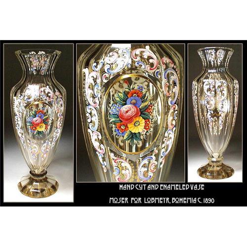 Outstanding, museum quality vase by MOSER for Austrian Lobmeyr. The vase is hand blown, panel (12) cut with medallion in the center. Hand enameled floral and ornamental decor with gold is exquisite... Impressive size - 12 inches high. Except couple small shallow flakes (repairable if desired) on the base rim the vase survived its 115 years of age in excellent condition. Great piece for your collection!!! Please note that in some cases photo sizes are automatically reduced, so if you want to see full size or detailed pictures, please email us ().