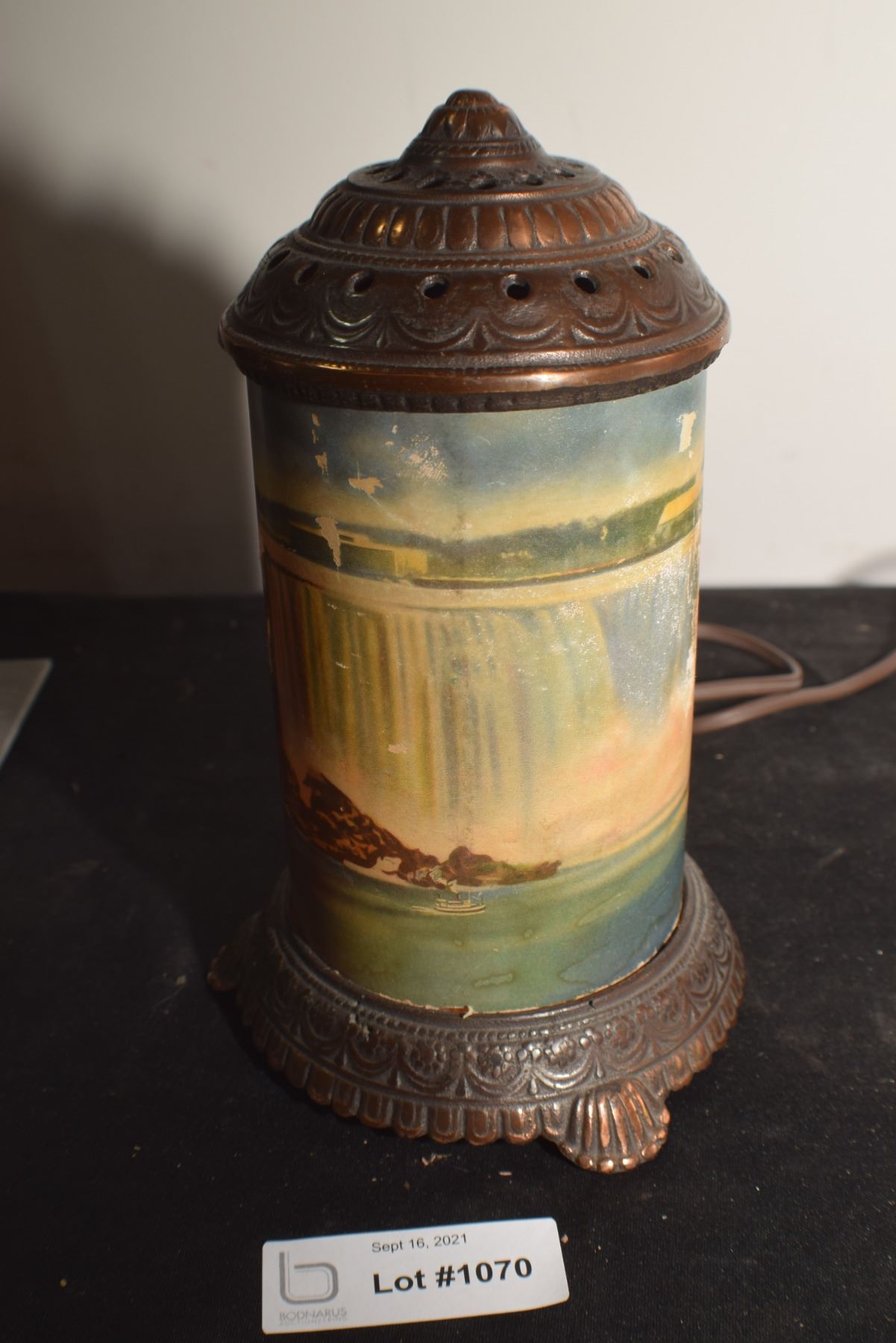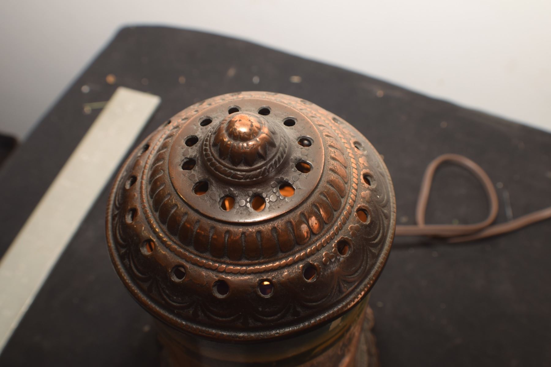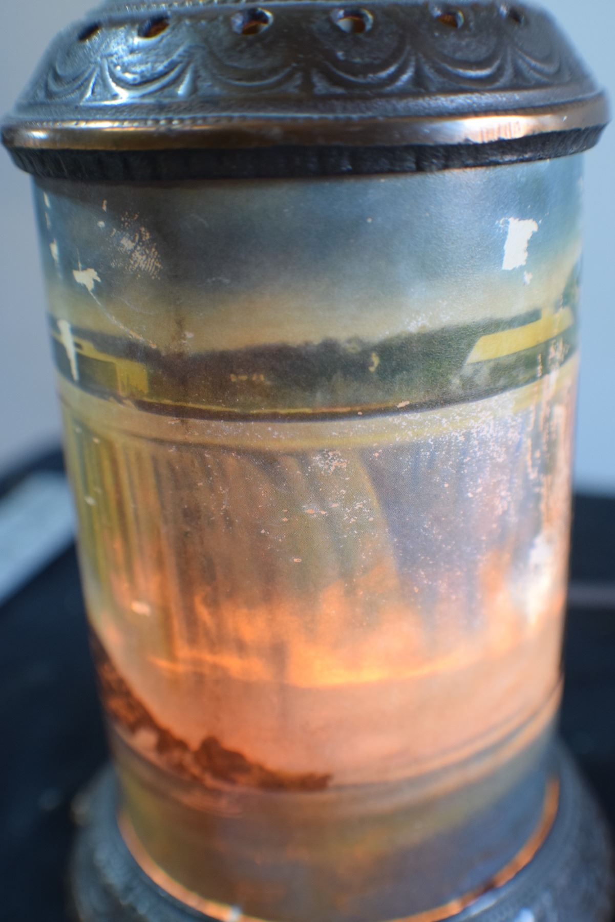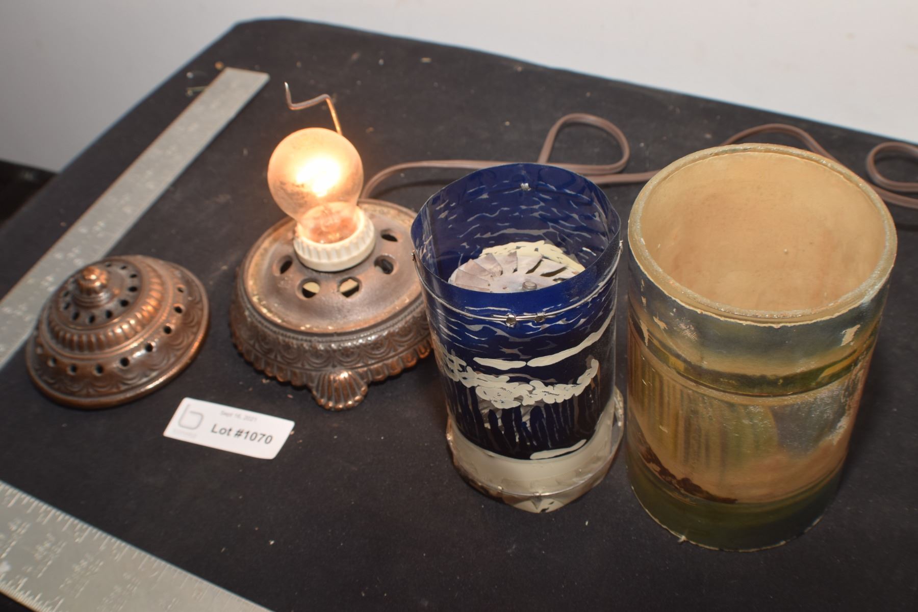 ANTIQUE MOTION LAMP ,BRONZE WITH GLASS CYLINDER / SPINNER IS EXTREMELY POOR