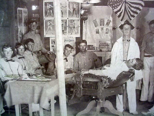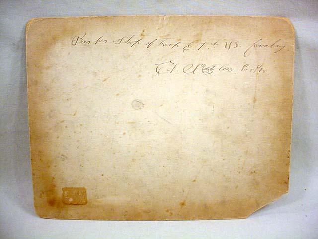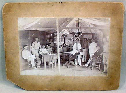 ANTIQUE MOUNTED PHOTO OF EARLY MILITARY BARBER SHOP W/ PHOTOS OF BOXERS ON WALL - Troop E, 7th US Cavalry. Approx. 7" x 9". Damage to Mount on Lower Left.