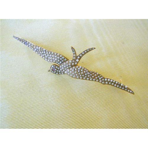 Exquisite antique natural seed pearl and 14k yellow gold "Soaring Bird in Flight" Pin . This graceful bird has a ruby eye and is 3 1/4" wide and just a beautiful gem for any collector. BURTON BROOK FARM ANTIQUES for great period gems. Please view our complete collection for some excellent buys.