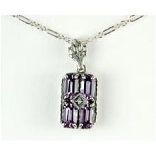 This Antique Style Pendant and Necklace is an Authentic and Accurate copy of a Necklace from the 1930s and THIS one is in MINT condition! It features a beautiful rectangular Genuine AMETHYST with a center DIAMOND. . The pendant measures 1/2" x 3/8 " and the necklace is 20" in length.