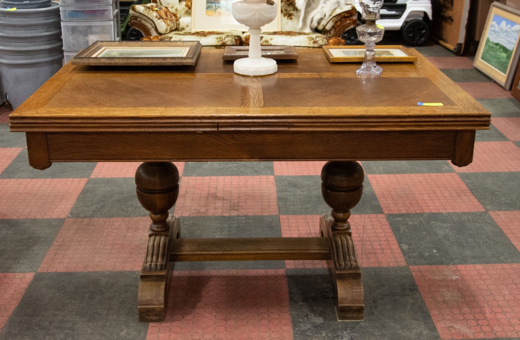 WITH TWO INTEGRATED FOLD OUT LEAVES. EACH LEAF 27.5" WIDE. TABLE OPENS TO 102" LONG WITH BOTH LEAVES **ALL ITEMS MUST BE REMOVED BY 5PM SATURDAY, JANUARY 28TH 2023. **ALL REMAINING ITEMS WILL BE SUBJECT TO A $6.00 PER DAY STORAGE CHARGE. ANY ITEMS REMAINING AFTER MONDAY, FEBRUARY 13TH, 2023 WILL BE CONSIDERED FORFEITED. NO REFUNDS WILL BE ISSUED FOR FORFEITED ITEMS. TO SCHEDULE A PICK UP APPOINTMENT CLICK HERE