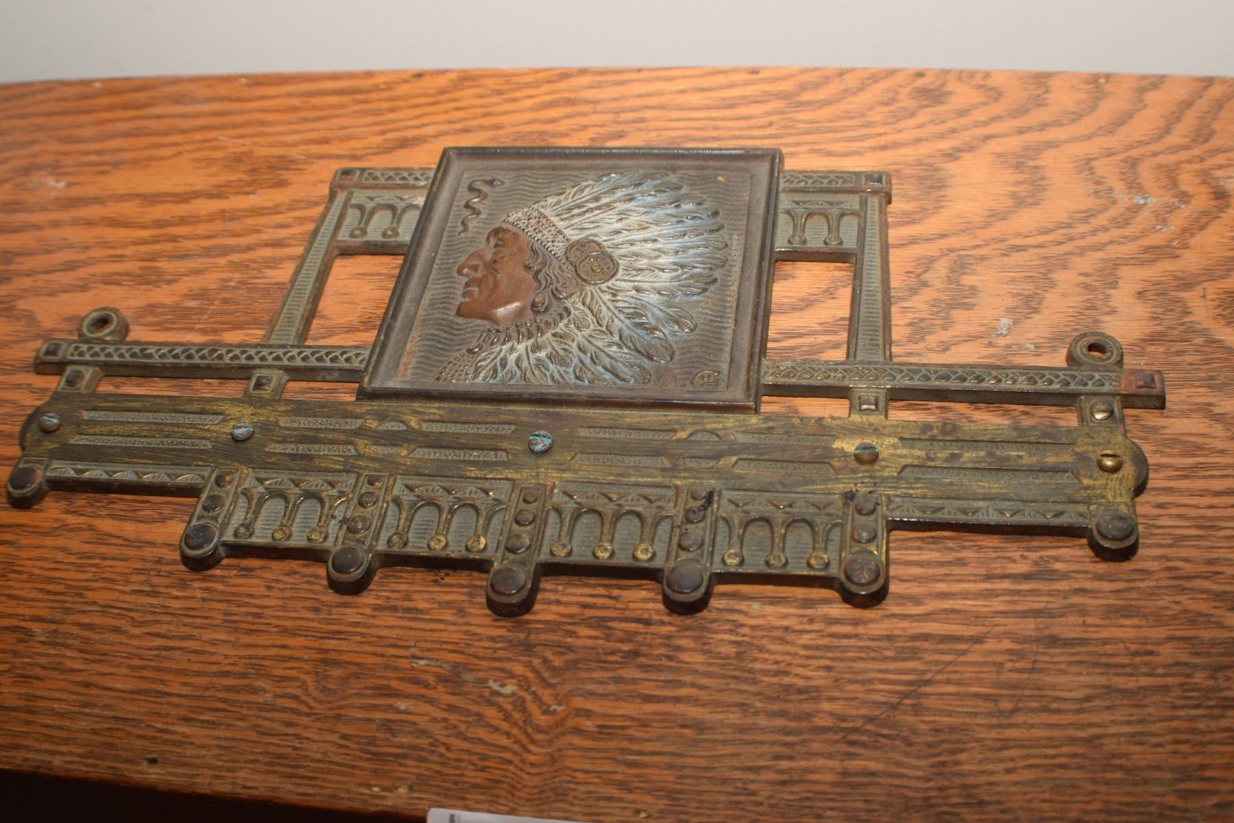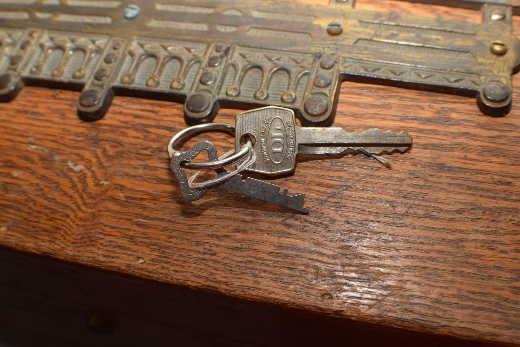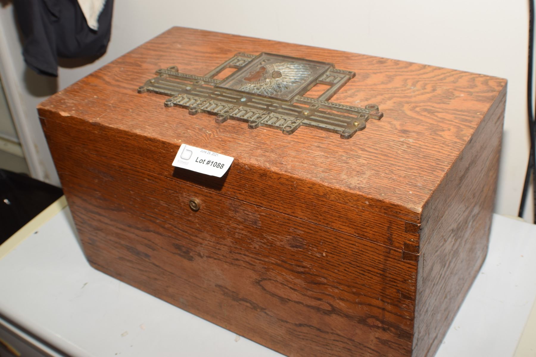ANTIQUE OAK DOVETAILED CHEST WITH LOCK AND KEY INDIAN CHIEF BRANDING