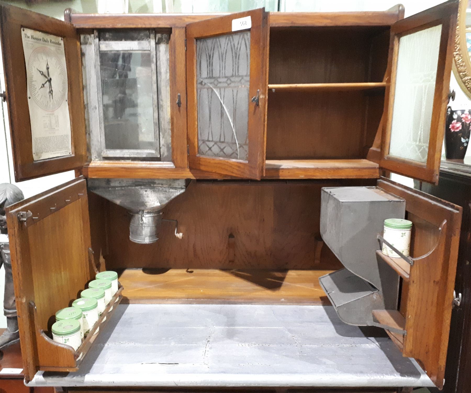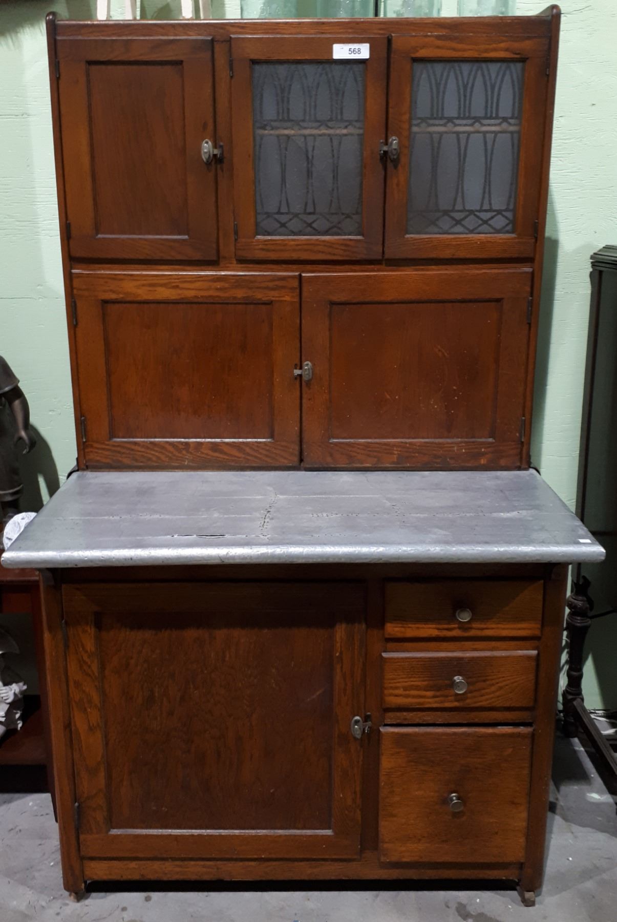HAS FLOUR SIFTER, BREAD BOX, ONION & POTATO BINS. ONE PANE IS CRACKED