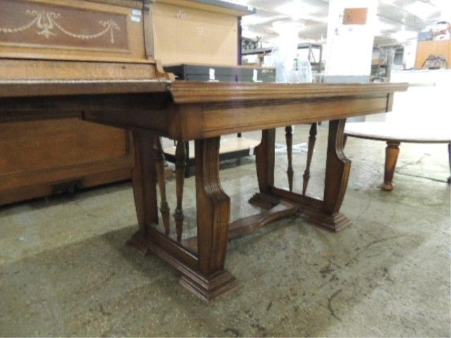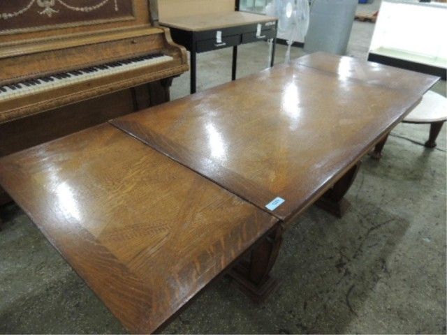 ANTIQUE OAK INLAID QTR SAW DINING TABLE & 2 EXTENSIONS. ORNATE PEDESTAL. 56X36 EXTENDS TO 93X36. AS SHOWN. VIEW PICTURE FOR DETAIL.