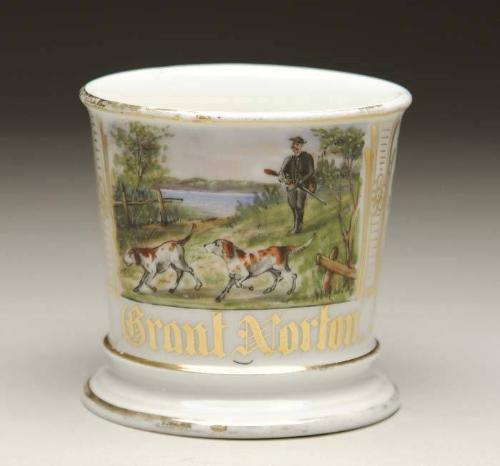 ANTIQUE OCCUPATIONAL SHAVING MUG WITH GENTLEMAN BIRD HUNTING. In the late 19th and early 20th century, if one frequented a local barbershop you would often have your own shaving mug. Most people, particularly if they had an occupation, had their shaving mug decorated with a subject matter representing their job, their interest or their history. This example apparently depicts the owner’s favorite pastime, bird hunting. Scene depicts a gentleman with shotgun following two pointers in a wooded landscape. The owner’s name, “GRANT NORTON” appears below the scene and there are gilt embellishments on either side of the scene. The underside of the mug marked “TMV LIMOGE, FRANCE”. The top and base of the mug and handle with gilt trim. SIZE: 3-1/2”. CONDITION: Very good. Painted scene in nice, strong detail.4-56602