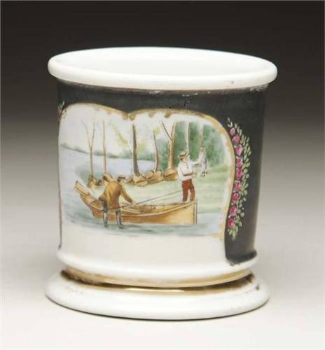 ANTIQUE OCCUPATIONAL SHAVING MUG WITH TWO FISHERMEN. In the late 19th and early 20th C., if one frequented a local barbershop you would often have your own shaving mug. Most people, particularly if they had an occupation, had their shaving mug decorated with a subject matter representing their job, their interest or their history. This example depicts two late 19th C./early 20th C. fishermen returning in a boat; one holds the catch, the other with fly rods. The vignette framed in fancy gilt with a floral bouquet and the sides of the mug painted black and the handle and edges trimmed in gilt. Trim is worn, black coloration is rather flat but the polychrome scene is generally very good. CONDITION: Very good. 4-56601
