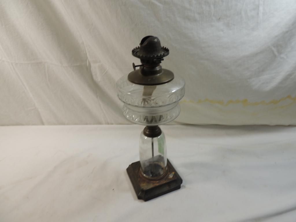 EARLY PATTERN GLASS METAL BASE OIL LAMP ANTIQUE OIL LAMP AS SHOWN SEE PHOTO FOR MORE DETAILS.