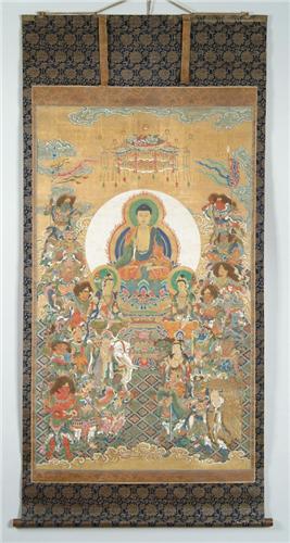 ANTIQUE ORIENTAL HAND PAINTED SCROLL. Probably 19th Century. Central Buddha figure in a white ball and flame background surrounded by warriors and women. Very colorful on a gilt gold background. The painting surrounded by blue and gold fabric. Contained in its original wood box, which is signed. SIZE: 73in. l x 35in. w. CONDITION: Very good. 4-54215