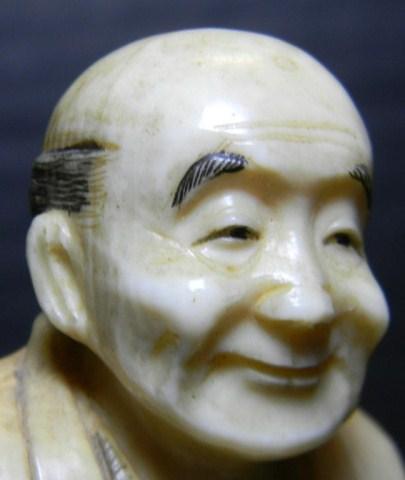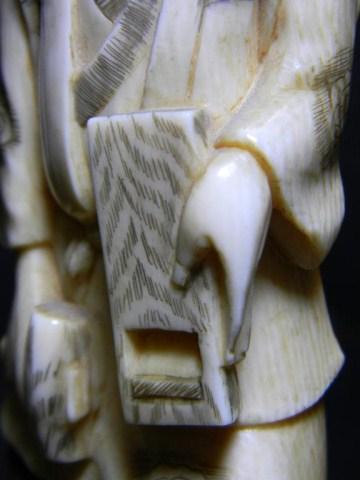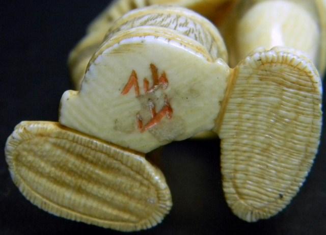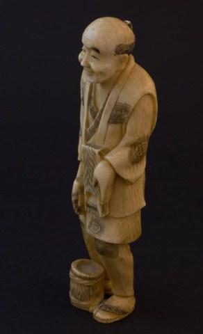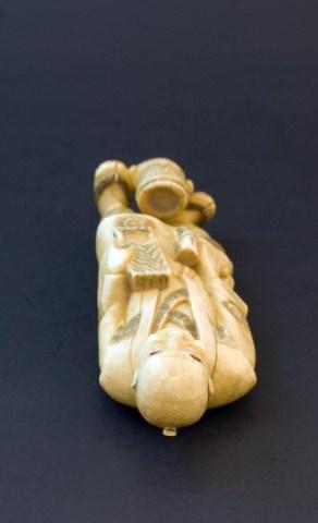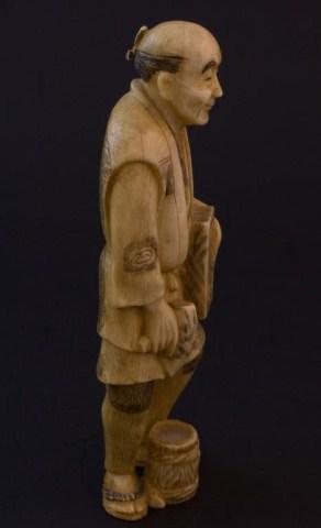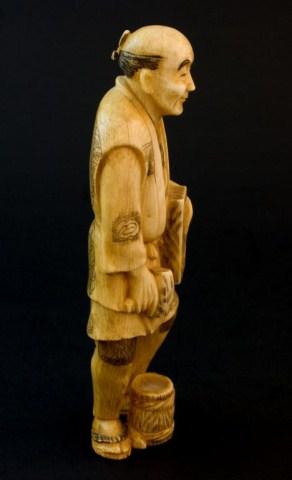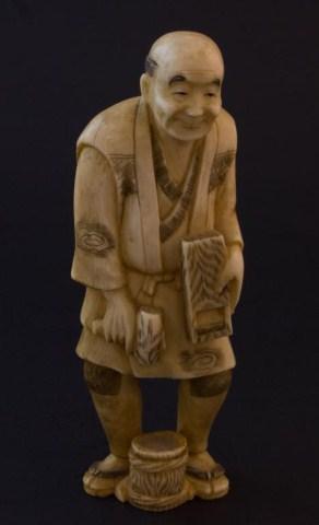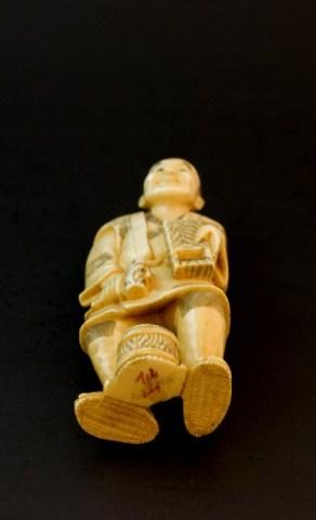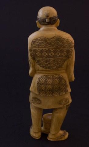 Depicts a man in layered robe holding a hammer and block of wood. At his feet is a hammering block. Signed to base. Measures 5 1/8" h.