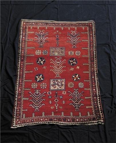 ANTIQUE ORIENTAL SCATTER RUG. Interesting design on a red field. Tree like shapes, octagons with stars with multiple border. SIZE: 73in. x 47in.. CONDITION: Generally very good, some old repair. 9-26282