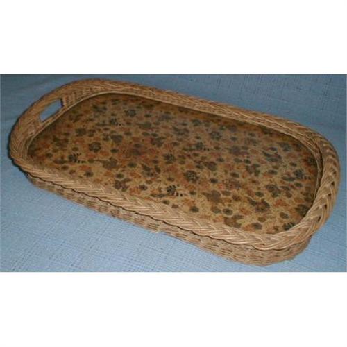 This is a very nice early 1900's wicker tray that is 14 1/2" wide x 22 1/2" long...the side is 3 1/2" high on the handle ends and is 2 1/4" high in the center. The wicker is nicely woven and is a putty color...there are several minor breaks in the wicker that do not at all detract from the appearance or stability of the tray. It has a glass top that covers a fabric that features oriental figures