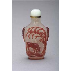 Finely carved, detailed and antique, Chinese red overlay on snowflake Peking glass snuff bottle with horses under trees motif and animal masks and rings at shoulders, 19th Century, jadeite stopper; H: 2 7/8"