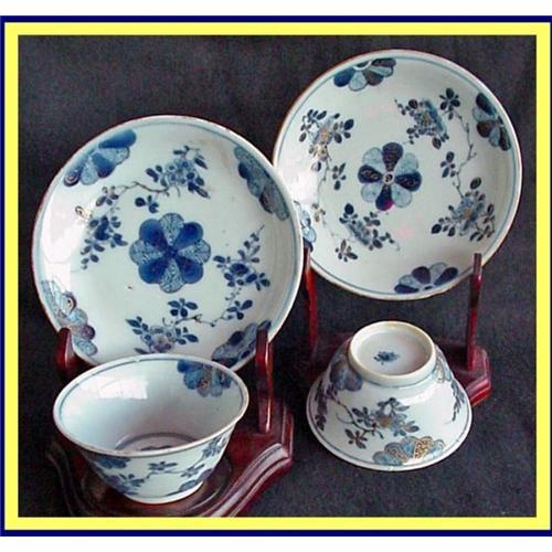 </font></strong>Antique pair of blue and white porcelain cups or tea bowls and saucers. Made China 1720 - 1750. <P><P>