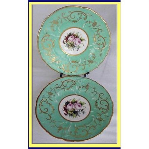 Pair of Russian plates made by the Kornilov factory, St. Petersburg (Leningrad), 1853-1917.<BR>Slightly under 8inches diameter.<BR>Undulating borders with wide gilded rim. Base colour is soft green with gold patterns and raised moulding. The center well of the plates contain a handpainted bouquet of flowers.<BR>Each plate is marked in dark red Kornilov factory mark under the Russian eagle. <BR>Some green has been lost on the raised ridges of each plate and one plate has a small rim chip.