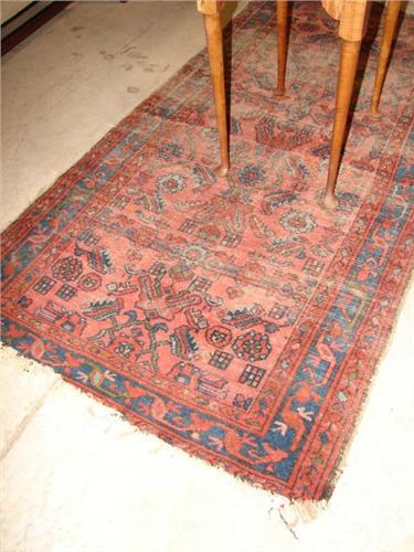 ANTIQUE PERSIAN RUNNER. Decorated with blue, red, and green colors. Shows excessive wear. 3.3' x 6.5'