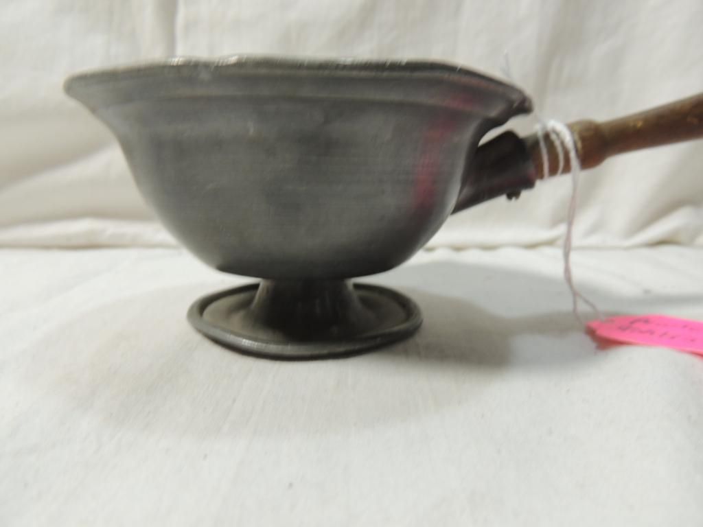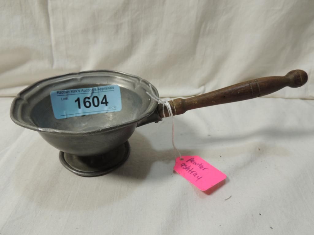 ANTIQUE PEWTER ASHTRAY WITH HANDLE. AS SHOWN SEE PHOTO FOR MORE DETAILS.