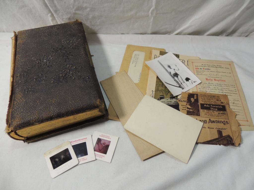EPHEMERA NEWSPAPER CLIPPINGS, BAPTISM CARDS, WEDDING INVITES, VINTAGE PHOTOS, SLIDES, ENVELOPE WITH STAMPS AS SHOWN. SEE PHOTO FOR MORE DETAILS.