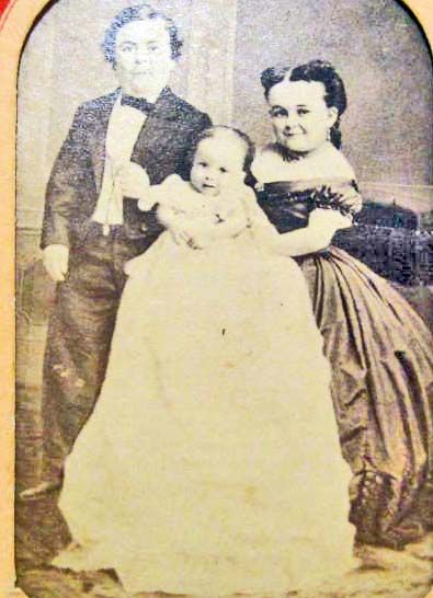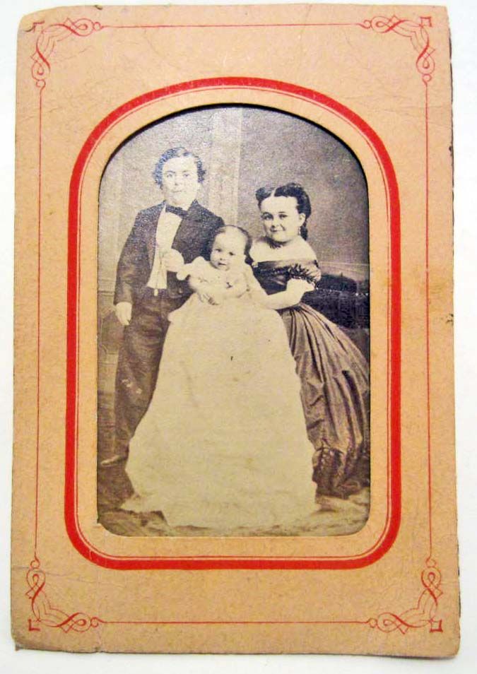 A real antique photograph of General Tom Thumb / Charles Sherwood Stratton, his wife, and his new born.