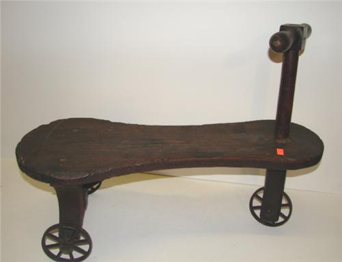 ANTIQUE PINE AND IRON SCOOTER. Original surface. Overall 24.5” L.